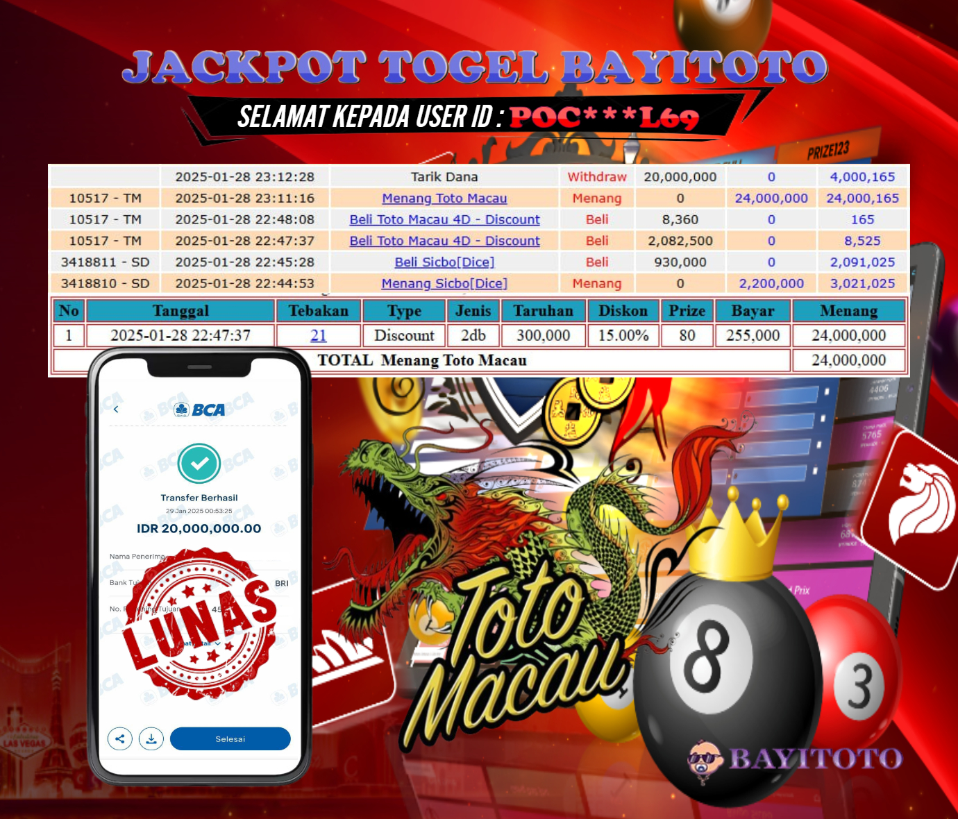 Selamat kepada User id : POC***L69 Telah berhasil mendapatkan kemenangan besar p